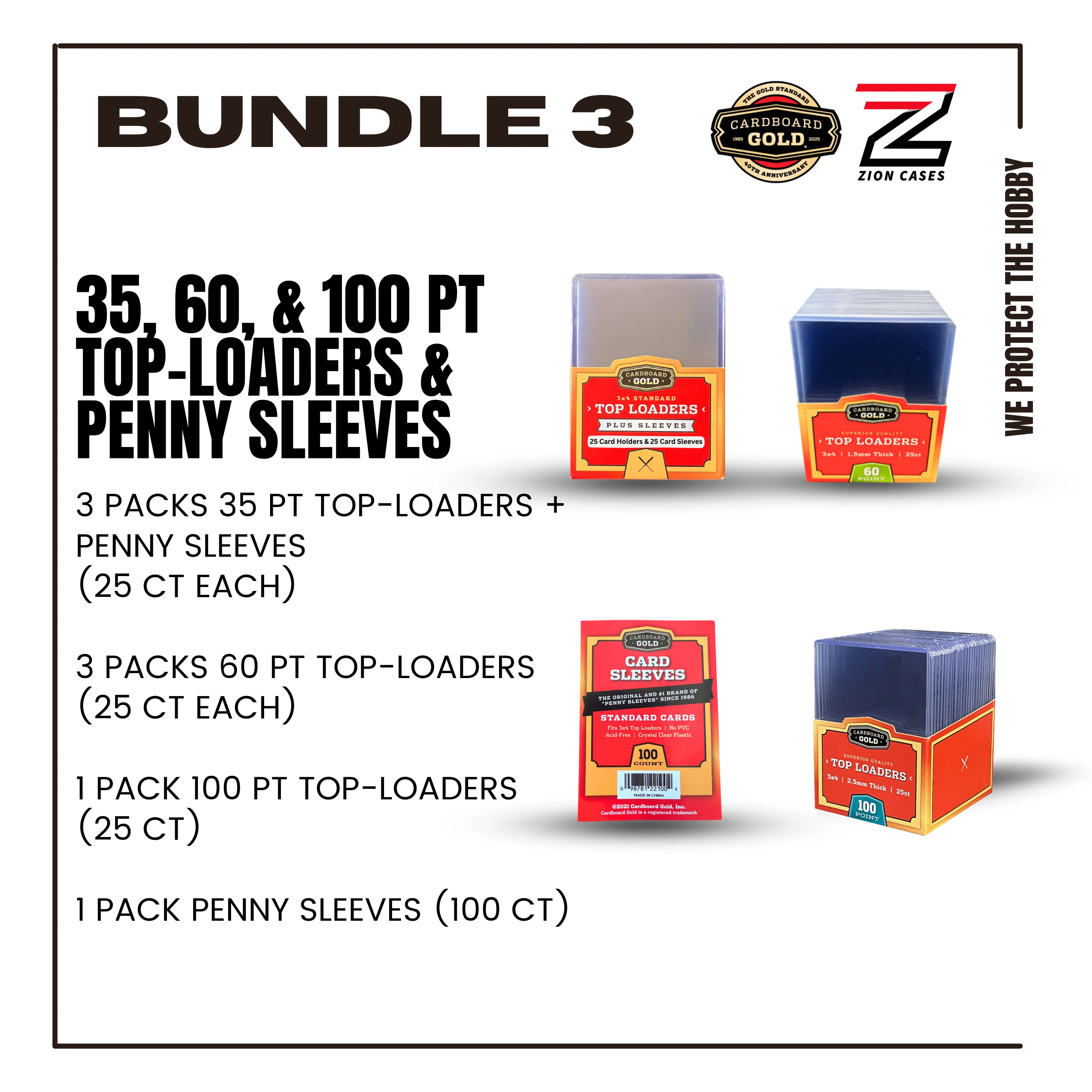 - BUNDLE 3 - 3 PACKS 35 PT TOP-LOADERS + PENNY SLEEVES(25 CT EACH), 3 PACKS 60 PT TOP-LOADERS (25 CT EACH), 1 PACK 100 PT TOP-LOADERS (25 CT), 1 PACK PENNY SLEEVES (100 CT) = $24.68